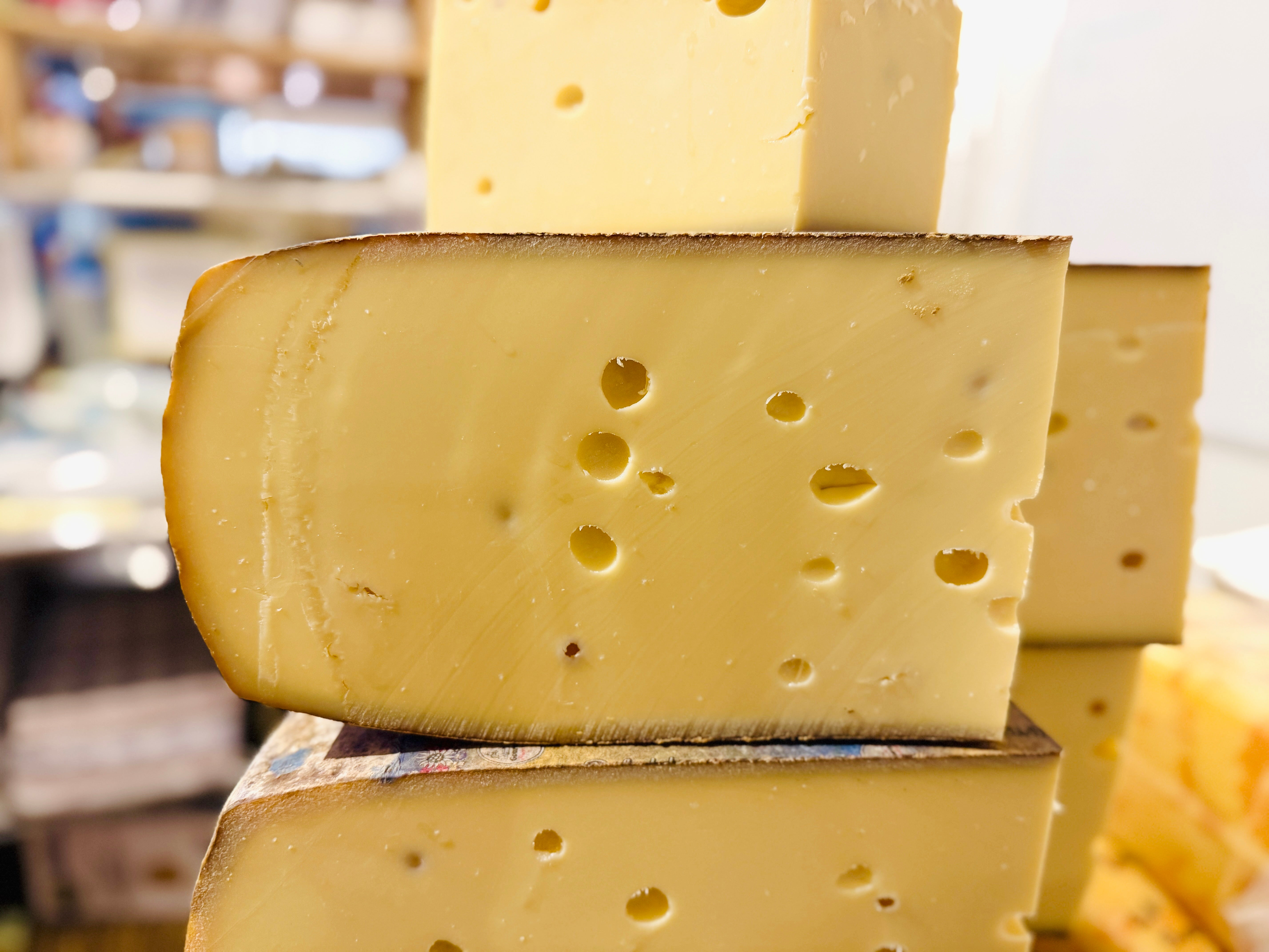 Emmentaler AOP is what most Americans see as the quintessential "Swiss Cheese": a big wheel with lots of eyes and a meltable texture. But the AOP rules are quite strict, and the milk used must be partially skimmed to qualify as Emmentaler.Â