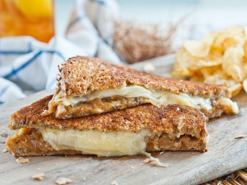GRUYERE SANDWICH Cave aged Swiss Gruyere and caramelized onion confit grilled on Wild Flour multigrain bread. ~Add Ham, Turkey, Bacon or Prosciutto