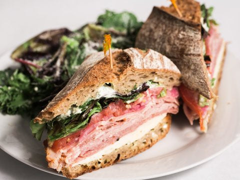 IL MOSTRO Spicy capicola, rosemary ham, rosa salami, provolone, pickled red onions, herb/pepperoncini mayo, lettuce, tomato on Wild Flour ciabatta.