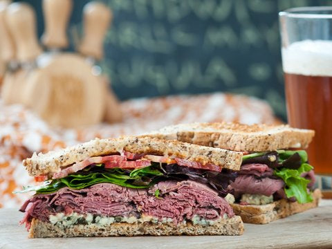 SMOKEY BLUE SANDWICH House smoked Mycella blue cheese, sliced roast beef, Worcester mayo, tomatoes and lettuce on toasted Wild Flour multigrain bread.
